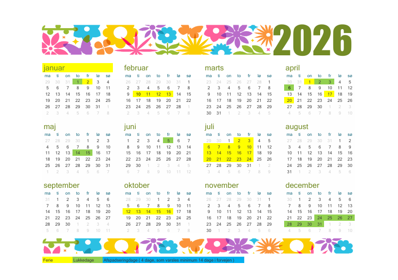 Dagen efter Kristi himmelfarts dag, Grundlovsdag, Juleaftensdag samt alle dage mellem jul og nytår.